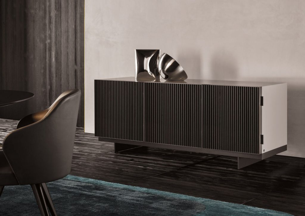 The fine craftsmanship inherent in the Aylon storage units emphasizes the poetically tactile qualities of wood and revisits the great cabinet-making tradition in a contemporary key.The sophisticated workmanship that distinguishes the Aylon family of cabinets traces back to the heritage of cabinet-making typical of Italy's Brianza area.The sleek shapes combine with a taste for refined details, like the unusual workmanship on the doors, created through the use of turned strips of solid oak, with open pore Moka color lacquer finish, set into an elegant metal frame with a matt Pewter color finish. The meticulous attention focused on each construction detail is also evident in the hinges, crafted from an exclusive Minotti Studio design. The hinges can be adjusted for height, width and depth and allow the doors to open 190 degrees. The structure comes in glossy lacquer Sand, Clay or Granite finish. The Aylon series includes two sideboards, a cupboard and a living-space unit featuring a clever play of shapes, with a lateral projecting storage element.The interior fittings for each element were carefully designed to respect the function served by each piece. The cupboard was crafted for placement in the dining room and the luxurious interior fittings are exquisitely suited to this use - opening the door turns on the LED strip lights positioned in the upper shelf. The space is thoughtfully divided to accommodate a clear, beveled glass shelf for storing glasses and a pull-out shelf covered in saddle-hide, a cutlery drawer also covered in saddle-hide, and two generously-sized drawers designed to hold plates and other tableware items.The sideboards are available in two sizes - with a center drawer and two side doors, or with two drawers and two side doors. Nestled inside the drawers is a saddle-hide covered cutlery tray. The structural base of the Aylon storage units, which rests on sleek, sophisticated metal blades with glossy Pewter color finish, was reinforced to ensure the utmost stability of each piece.