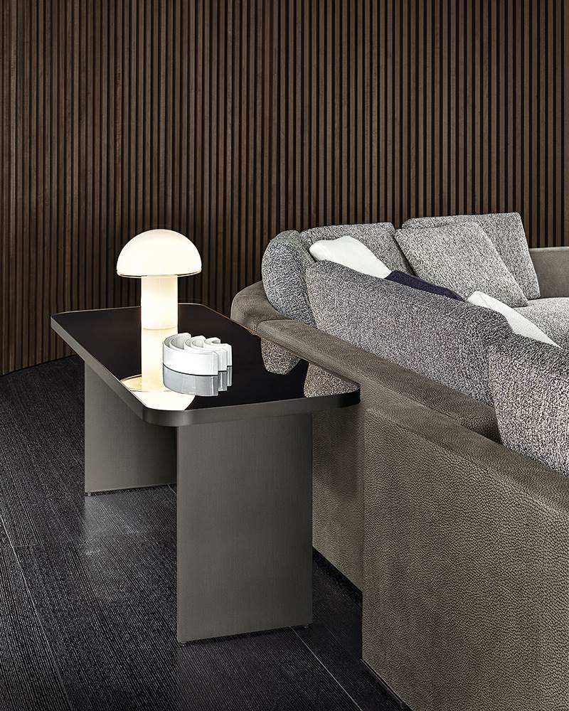 A minimal shape, made precious by the materials used, characterises the Clive family, a story told through a series of consoles, side tables and benches. The tallest version, 60 cm in height, is the Clive side table to be placed behind the couch, whereas the 39 cm tall version makes the Clive coffee table an ideal surface positioned level with the sofa. The two heights can also be combined, creating an elegant overlay effect. Clive rests on the ground on two satin aluminium blades in Malt colour that support its square top with rounded corners. The top, available in three versions - Zebrino marble, back-painted Black or Moka lacquered brushed wenge - is embraced by a band of satin metal in Malt colour, framing it like a crown. A stylish detail that reminds us of the attention to decorative value assigned by the savoir-faire of master craftsmen. The Clive family is completed by a series of benches with padded seats, upholstered in leather or fabric, enhanced by an array of seams that underscore its fine sartorial quality.