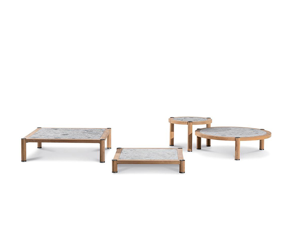 The concept of the Daylight outdoor seating system inspires the design of an entire family of coffee tables with cylindrical legs and a natural teak frame housing an embedded top in Ceppo di Gré a natural ornamental stone typical of Lombard architecture.