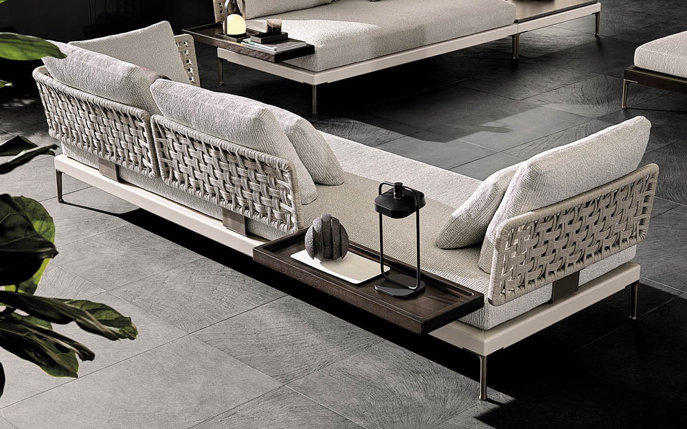The variety of potential compositions becomes even more interesting when the selected materials are masterfully combined: the extruded aluminium base with matt finish in the shades of Ecru and Dark Brown is accompanied by steel backrests, covered in woven polypropylene cord in the same shades, according to a Scandinavian-type geometric design.