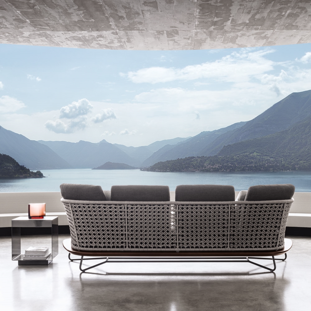 The Rivera collection suggests a contemporary interpretation of retro elegance reminiscent of a typically Mediterranean vibe. This project is driven by a desire to experiment with contrasts and unique combinations of materials for the outdoors - lightweight metal, the reassuring warmth of wood, sophisticated weaves and the amazing elegance of fabrics - all contribute to transform even outdoor spaces into intimate and cozy settings. A slender handcrafted base in solid iroko heartwood supports an enveloping backrest in woven polypropylene fiber, available in Light Grey and Dark Brown colors. The "cannage" effect weave requires great skill and manual ability as well as tireless, patient workmanship. The Rivera collection includes a two-seat sofa and a three-seat sofa, armchairs, ottoman, coffee table and chair that define retro elegance in contemporary language, using innovative materials to evoke sensations reminiscent of warm, typically Mediterranean settings, whether on a lakeside veranda or terrace overlooking the sea. A premium wood, solid iroko heartwood - universally appreciated for its durability and waterproof qualities - adds great value to the base of the painstakingly hand-finished Rivera seating elements. The unique shape of the cantilevered wood frame that is distinctive to the 98 cm-deep armchair, as well as the two-seat sofa and three-seat sofa, allows it to be used as a table surface for glasses or other small objects. The 84 cm-deep Rivera armchairs - perfect for pairing with the two-seat sofa - have restrained proportions and can also be used in projects where space is at a premium. Designed to fit seamlessly with the various seating elements, the coffee table comes with the top in fine grain, brushed, Silver Beola stone, set into the wood frame, for an extremely refined effect and timeless elegance. The Rivera chair, with its compact design and graceful lines, epitomizes all the aesthetic values of the project and the ideal combination of materials. It rests on a sinuous Pewter color painted tubular metal structure specially treated for outdoor use, as are the padding materials for the soft cushions that are covered in water-proof fiber.