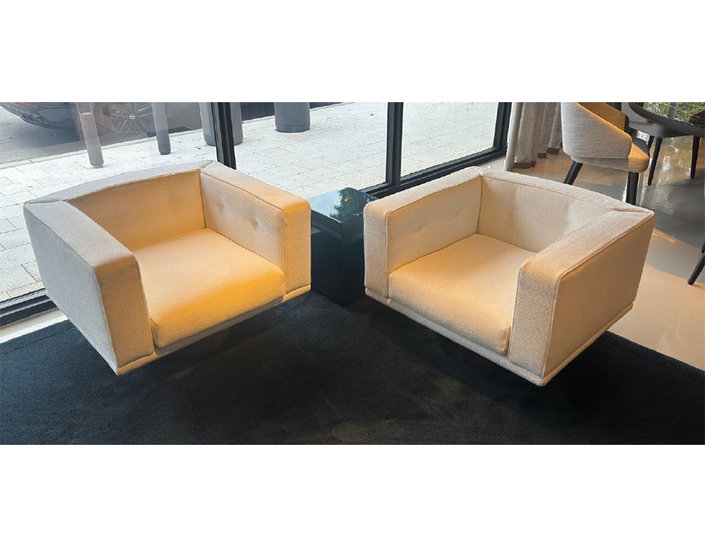 Set of two swivel armchairs in Martin Gesso color fabric, with base in Chrome Metal. In good condition, fabric has some stains.